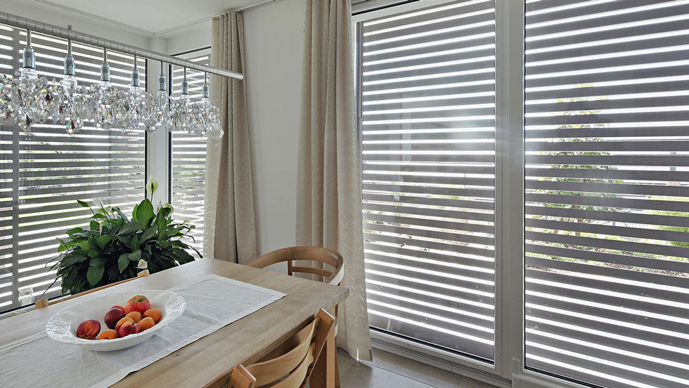 Da bei Neubauten in der Regel große Fensterflächen mit einer Verschattungsmöglichkeit zu versehen sind, bestimmen die Schiebeläden einen Großteil der Fassade und werden zum dominierenden Gestaltungselement. Das Interieur lässt sich mit Schiebeläden sowohl vor zu hoher Sonneneinstrahlung als auch vor neugierigen Blicken mit unterschiedlichen Füllungen schützen.